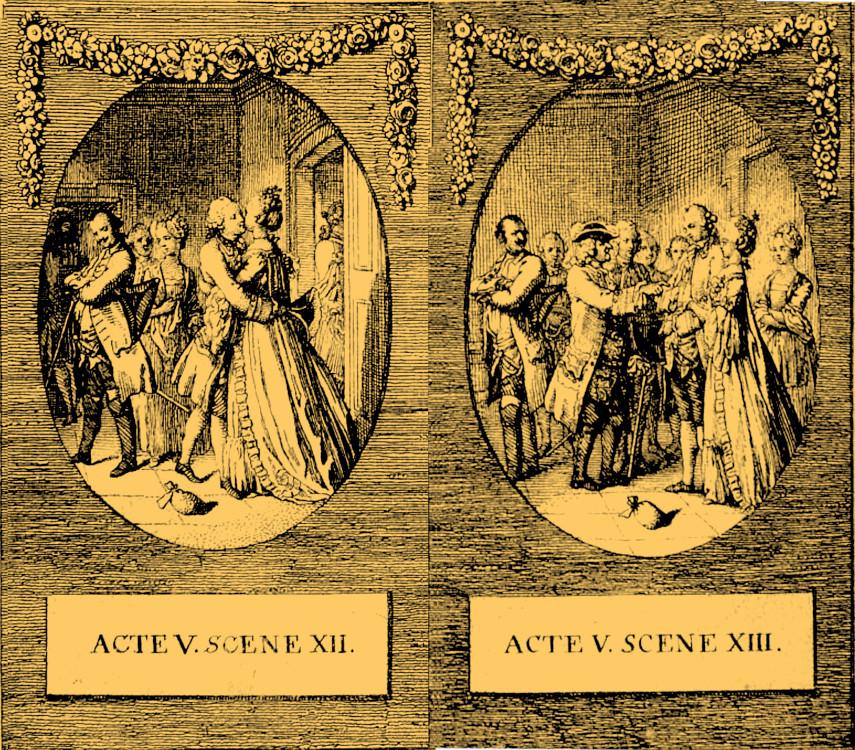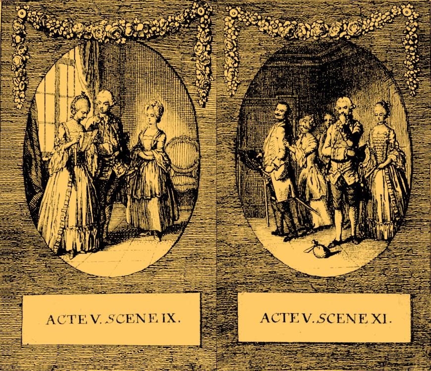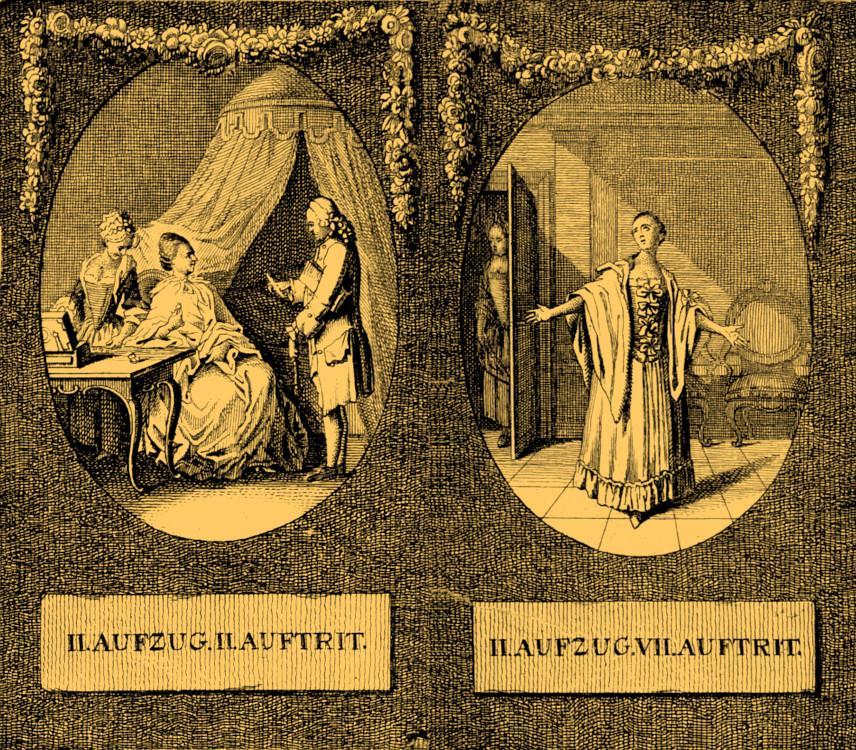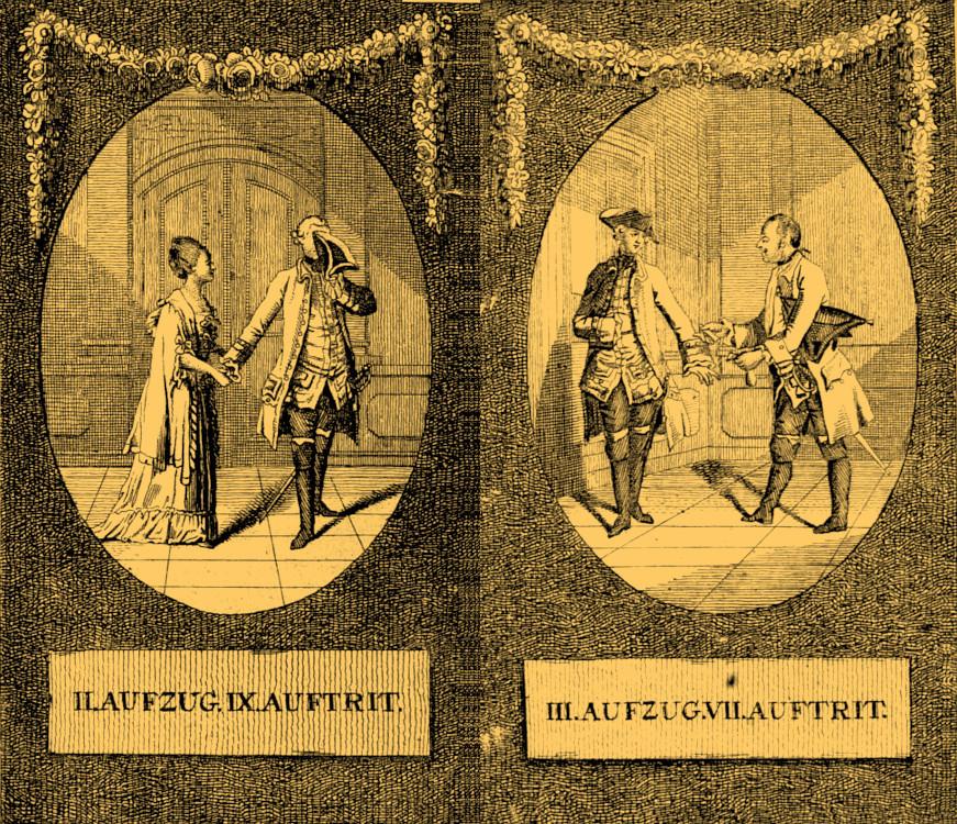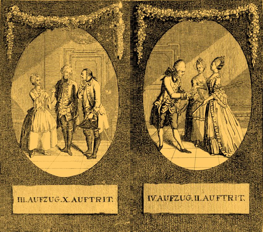 (Here and following: Daniel Nikolaus Chodowiecki, Illustrationen zu Lessings Minna von Barnhelm [1769]; Genealogischer Calender auf das Jahr 1770. — Translations: Minna von Barnhelm or Soldier’s Fortune, trans. Otto Heller [New York 1917].)